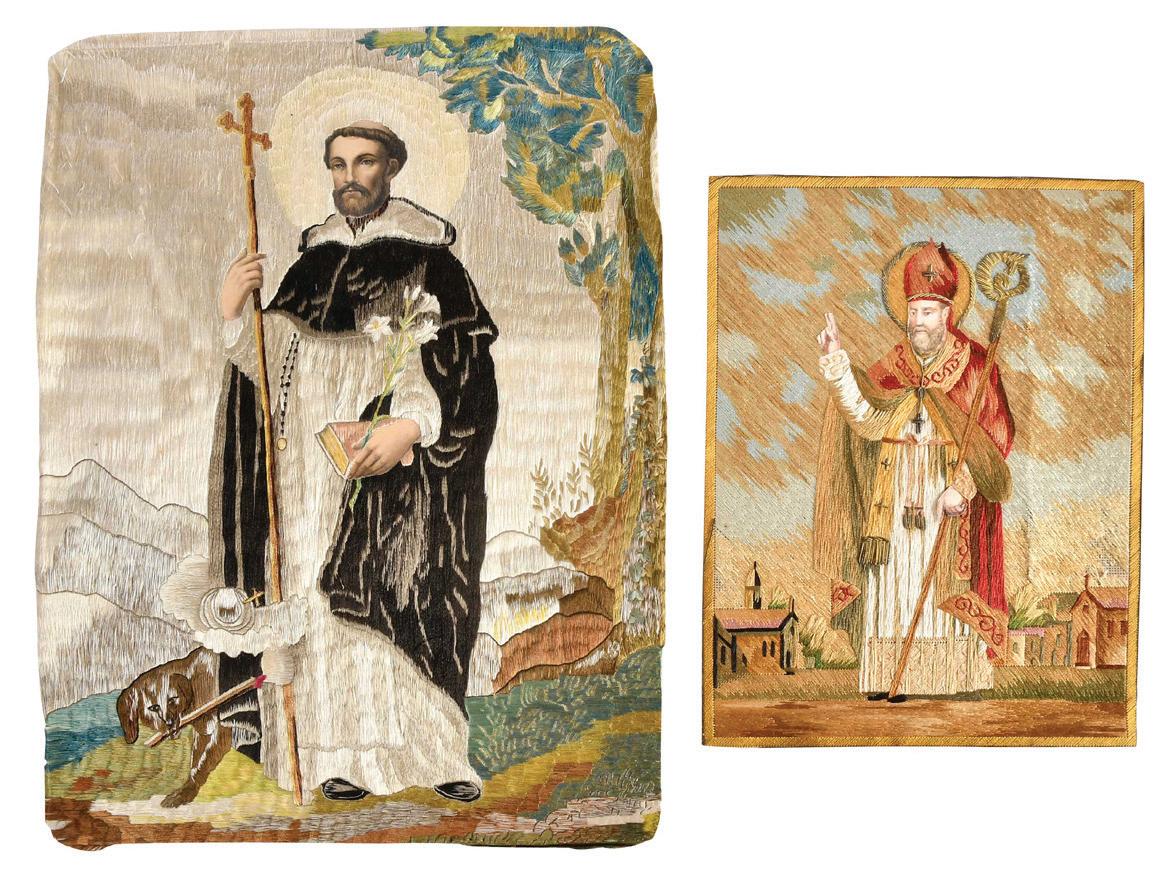 Two Italian Silk and Watercolor Needlework Pictures of Saints 19th century, one depicting St. Dominic with a hound and one depicting a bishop saint holding a crozier, larger 16 x 12-1/4 in., unframed, minor fraying at edges; larger with small tear at lower left edge, some areas of thinning throughout Provenance: Gift of Margaret S. Bedell of Catskill, NY, to the Brooklyn Museum, 1932; Property from the Brooklyn Museum