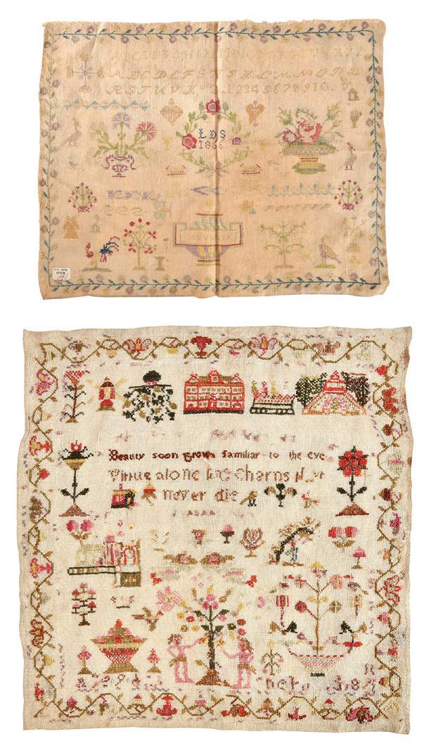 Two American 19th Century Pictorial Needlework Samplers possibly Mormon, sampler initialed and dated “LDS/1866”, possibly for Church of Jesus Christ of Latter Day Saints; sampler inscribed “Beauty soon grows familiar to the eye/Virtue alone has charms that/never die”; larger 16-1/2 x 16-1/4 in., some fraying to edges, some discoloration and slight staining to backing; beauty example with notable loss to stitching, notably at verse and potential signature