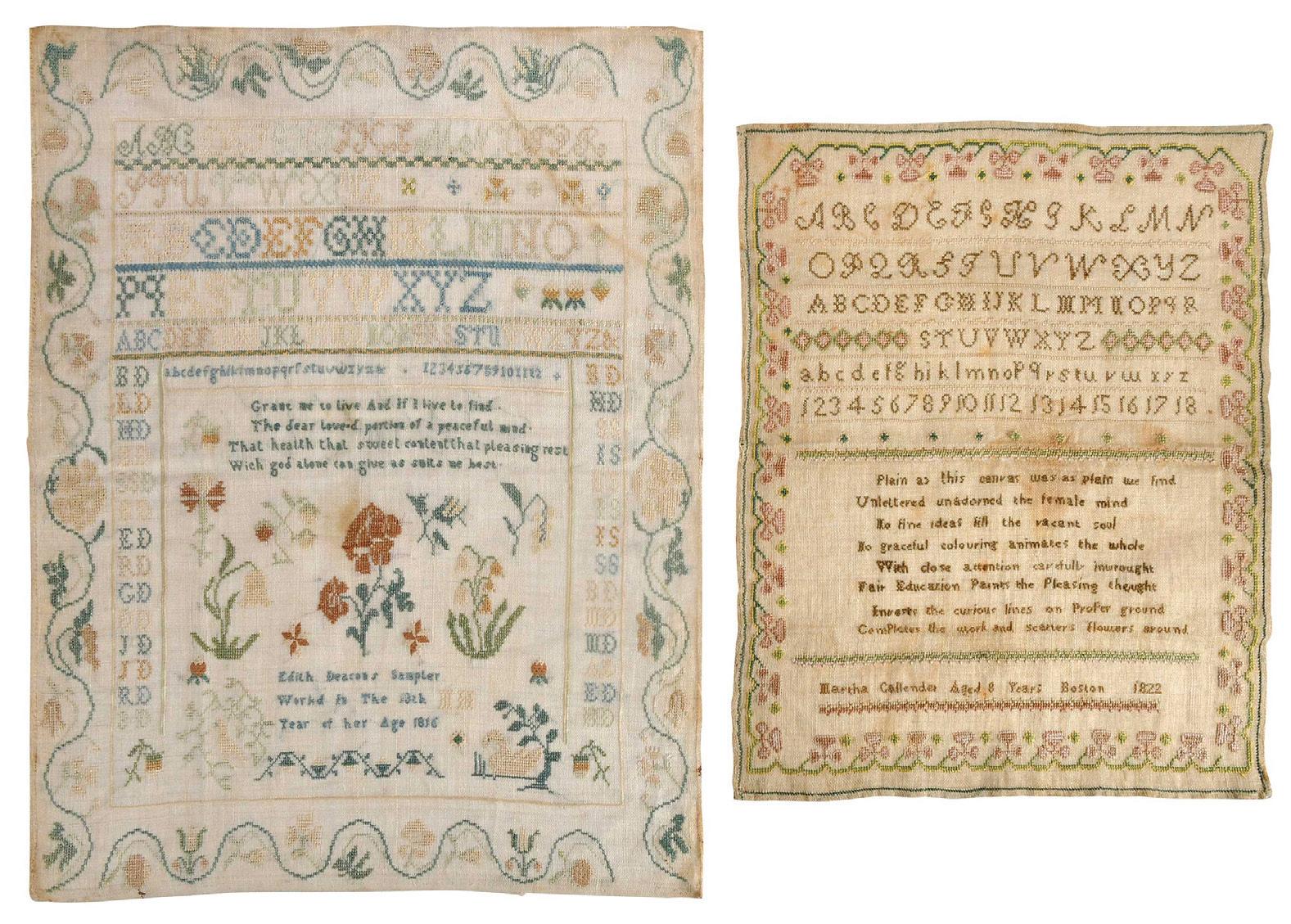 Samplers, two silk on linen alphabet, numbers, and verse samplers: one Boston, Massachusetts, signed and dated “Martha Callender Aged 8 Years Boston 1822”, with floral border, cross and queen stitches, 16-3/4 x 13-1/2 in.; one Burlington, New Jersey, signed and dated “Edith Deacon’s Sampler Workd in The 13th Year of her Age 1816”, with initials of family members and Quaker-style motifs enclosed in a floral border, cross, satin, and queen stitches, crossed corners, 21-3/4 x 17 in., slight fading of embroidery, fraying to fabric edges, with light staining at centers