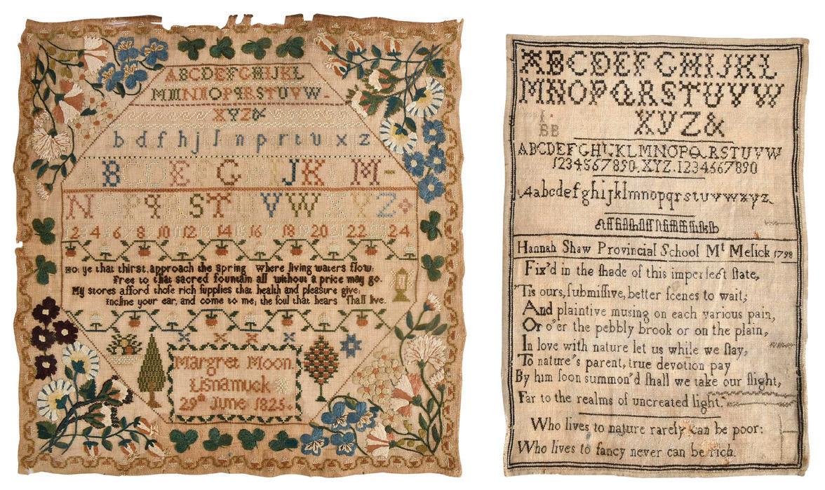 silk on linen, both unframed, comprising: signed and dated “Hannah Shaw Provincial School Mt Melick 1798”, with alphabets and verses surrounded by a narrow border, 16-1/4 x 11-1/2 in.; signed and dated “Margret Moon Lisnamuck 29th June 1825” with alphabets, numbers, verses, strawberry borders, large sprays of flowers at corners, and three-leaf clovers, cross, square eyelet, satin, and split stitches, 17-1/4 x 17 in., Shaw example lightly glued to paper backing at corners, with overall toning, scattered fraying at edges, scattered holes, lacking stitches in border; Moon example with stain to linen at sampler bottom, heavy fraying along edge of top