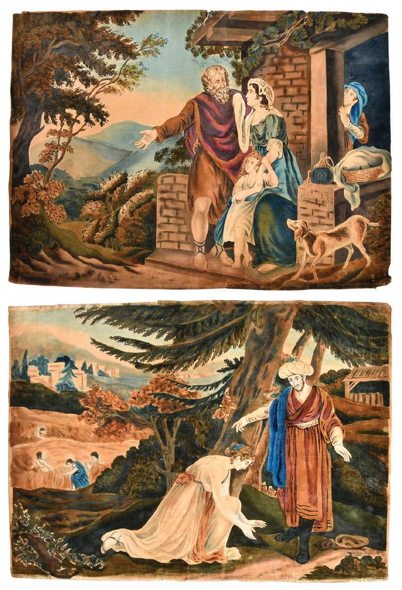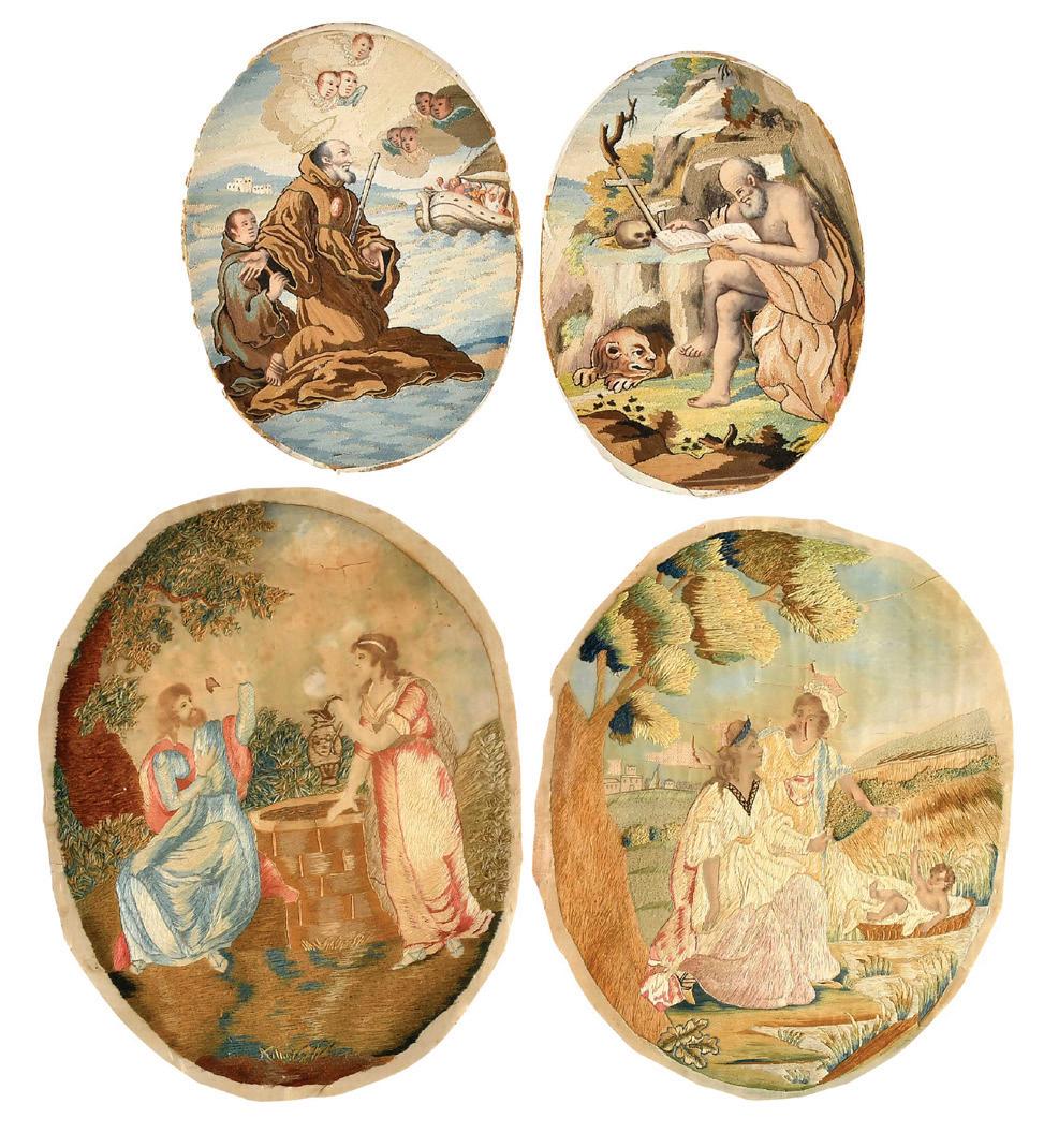 Continental/possibly English, silk, wool, linen, and paint, larger pair each approx. 14-3/4 x 11-3/4 in.; all unframed, shattering to some silk backings, some looseness and losses to stitching, fading, some roughness and loss to edges; larger pair with some staining to backing