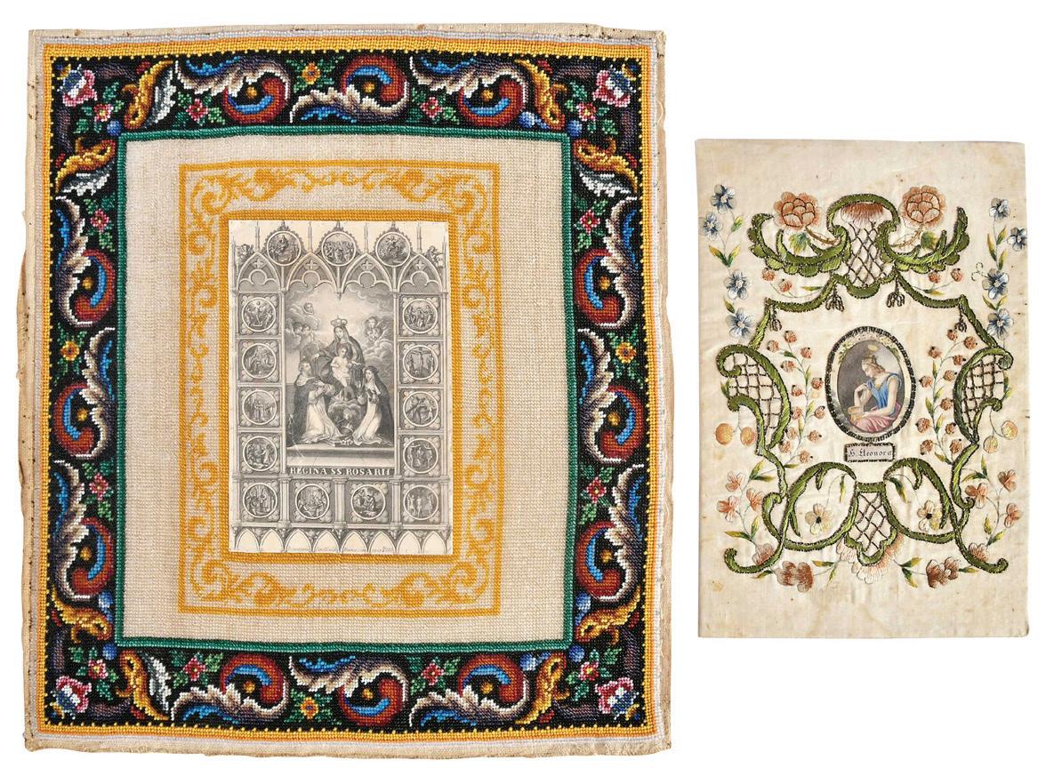 Two Italian 19th Century Prints of Saints with Textile Borders print of Madonna of the Rosary, inscribed along base “Romapress(?) l’inc.Luigi Banzo. con properta(?) 1855” within polychrome glass beadwork border, on linen backing, 13-1/8 x 12 in.; print of Saint Eleanor within silk and needlework border, on board, 8-3/4 x 6-1/4 in., Madonna example with some fraying to edges of backing, some lifting to print in lower right corner, some abrasions and creasing to print; Eleanor example with spotting, stains, and discoloration