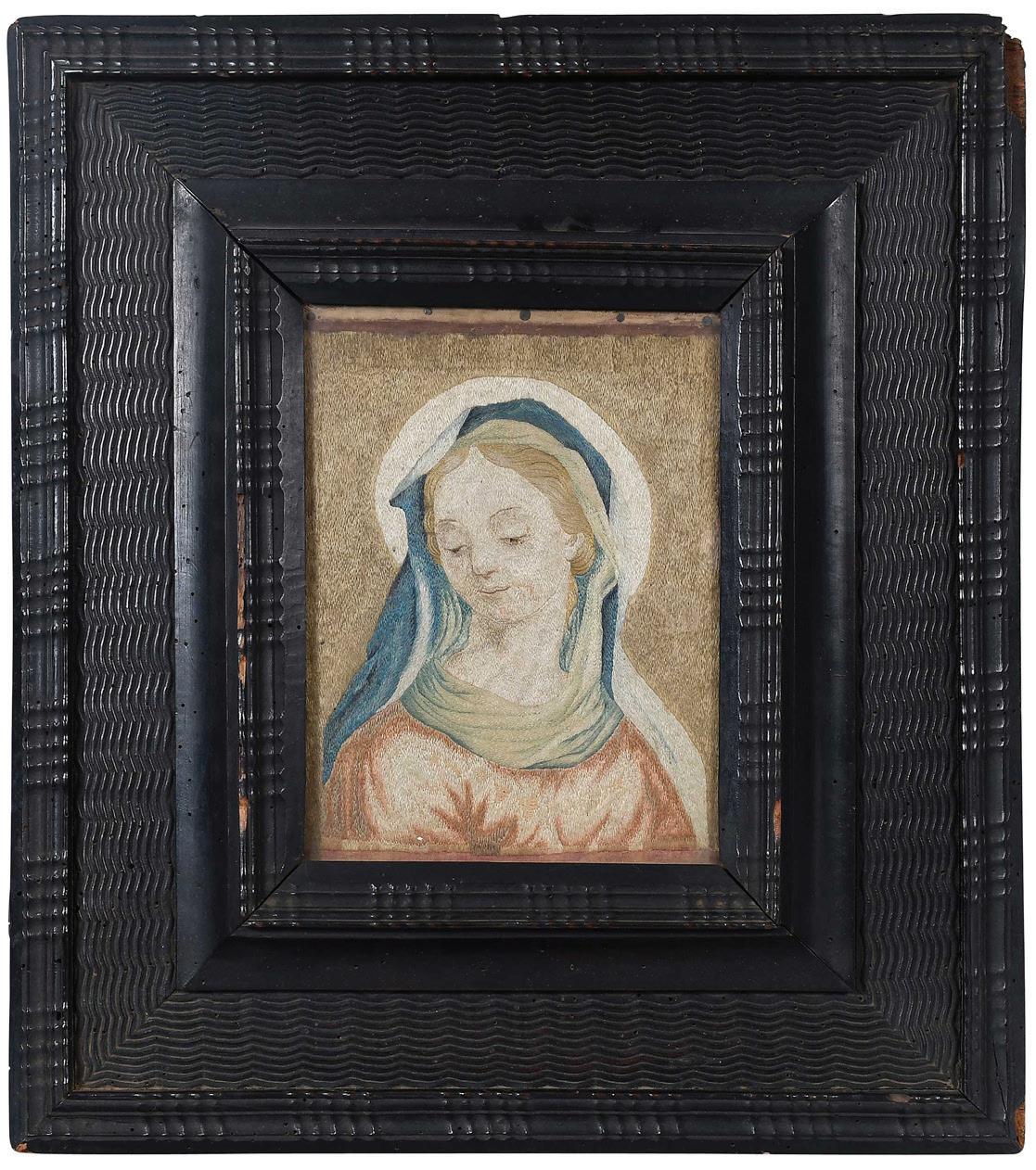 Framed Italian Needlework on Linen of Madonna late 17th/early 18th century, silk on linen, sight 8-1/2 x 6-1/4 in.; in carved and black painted wood frame, 17-7/8 x 15-7/8 x 2-1/2 in., some slight fading to needlework, hole to left border; not examined out of frame, slightly off center in frame, frame with pest damage, chips, and some cracks and loss to paint