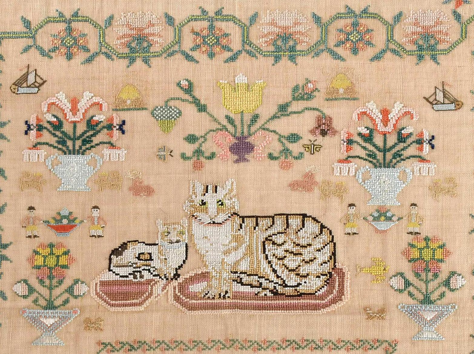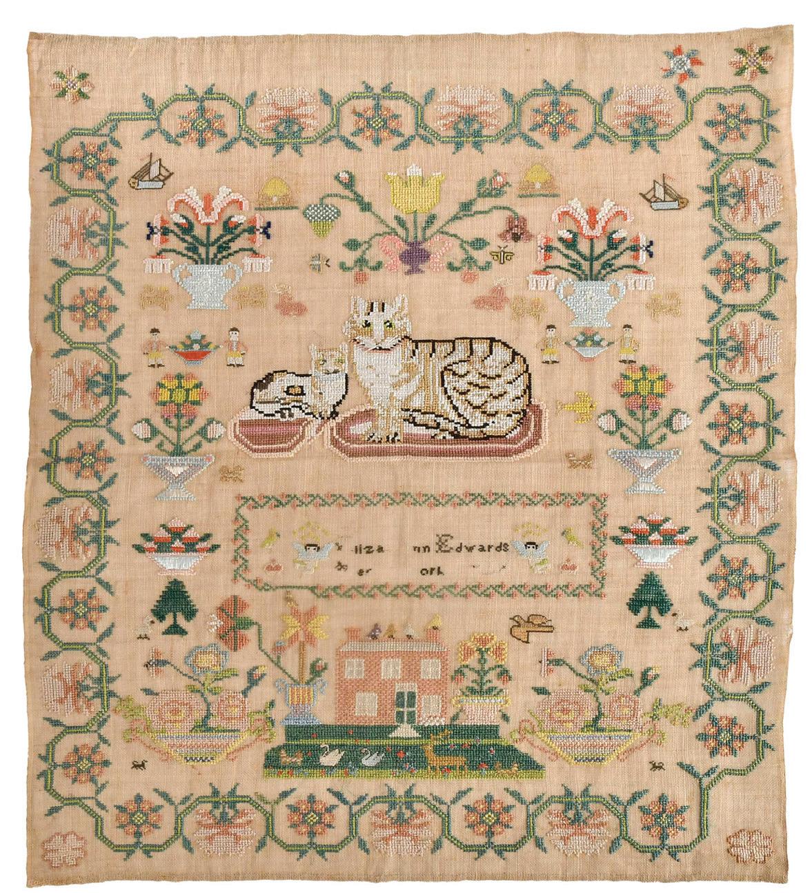 Monumental American Signed and Dated Needlework Sampler with Cats signed and dated “Eliza [A]nn Edwards”, with two felines, 13 urns of flowers, detailed house scene, bee skips, boats, angels, and crowns, surrounded by a wide rose border, silk on linen, cross and satin stitches, 24 x 22 in.; unframed, mild fading to pink and rose silk threads, lacking stitches in the inscription