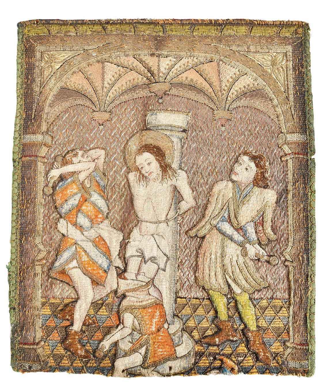 17th Century Embroidery Fragment, Flagellation of Christ possibly German, silk and gilt metal on linen, 11-1/2 x 9-3/4 in., some loose threads, fraying, and small tears at edges, some loss to stitching throughout Provenance: 1928, bequest of William H. Herriman of Rome, Italy; Property from the Brooklyn Museum