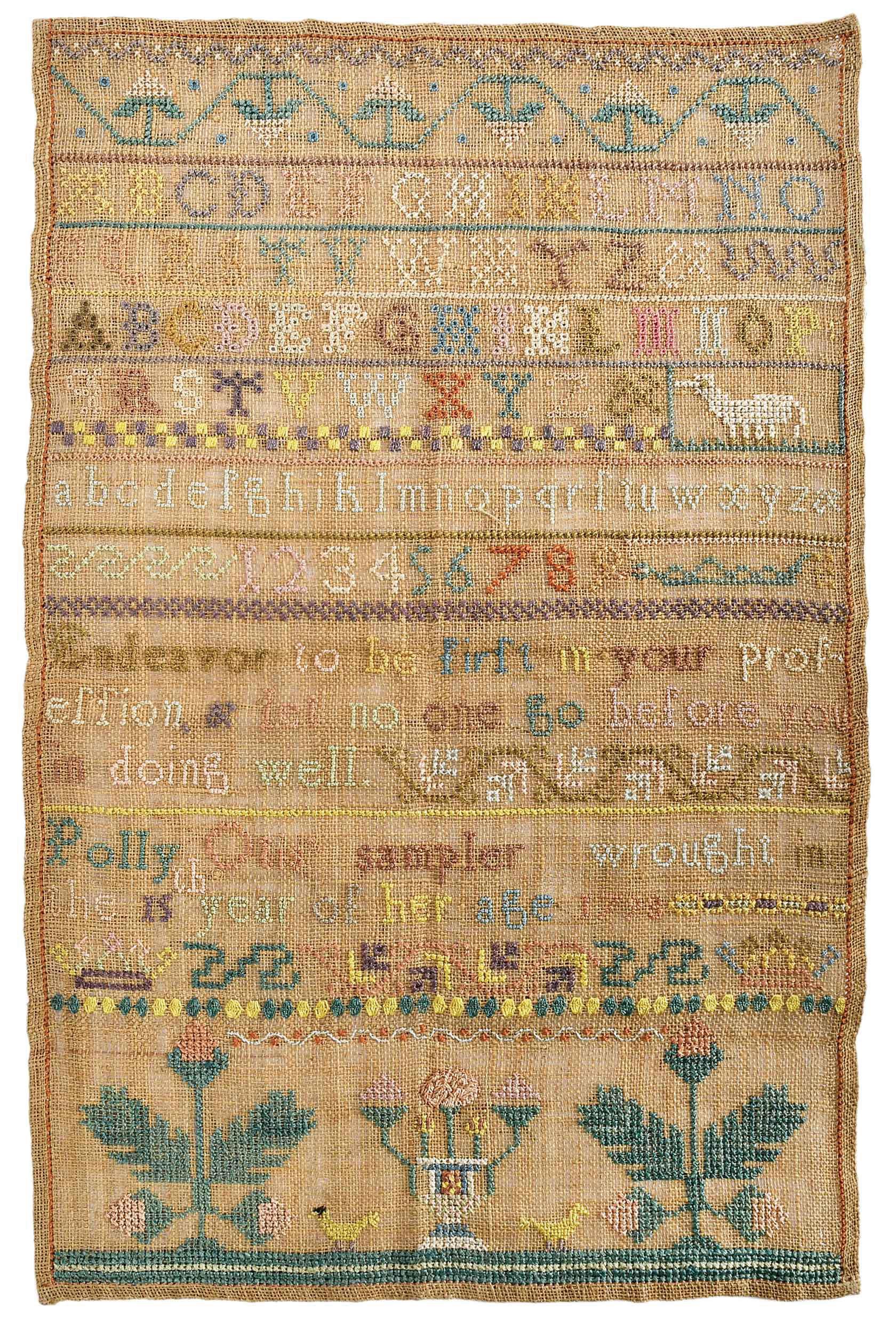 Important Scituate, Massachusetts Signed and Dated Needlework Sampler signed and dated “Polly Otis’ sampler wrought in the 15th year of her age 1798”, with alphabets, numbers, motto, flora and fauna, and horizontal borders, silk on linen, 16 x 10 in; unframed, good overall condition, minor wear commensurate with age