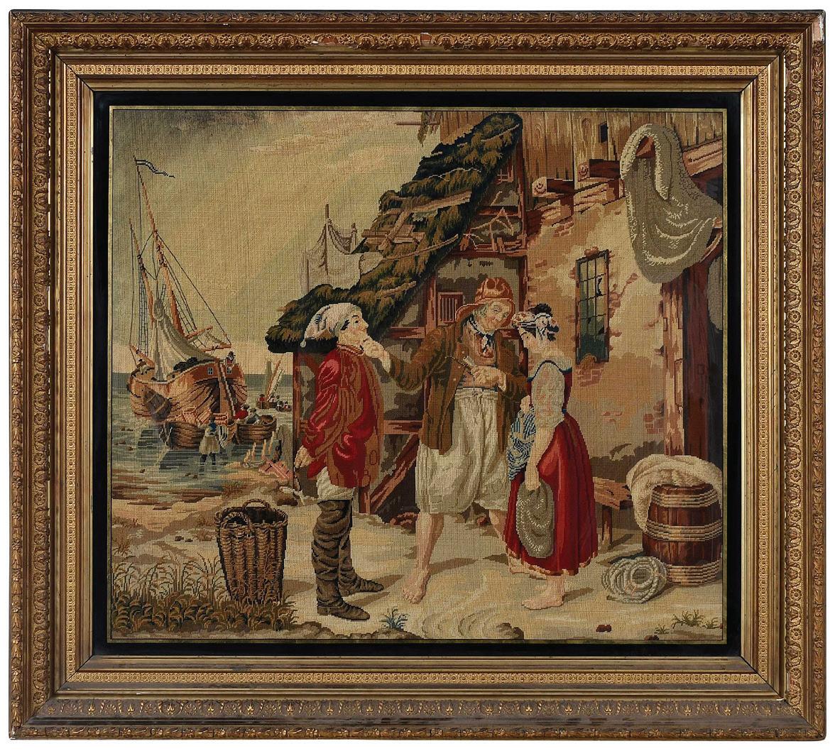 circa 1840, depicting a sailor departing home, sight 27-1/4 x 31-1/2 in.; carved and gilt wood frame, 37-3/4 x 42 x 3 in., not examined out of frame, some toning and fading throughout; frame with wear and some loss to veneer, surface dust