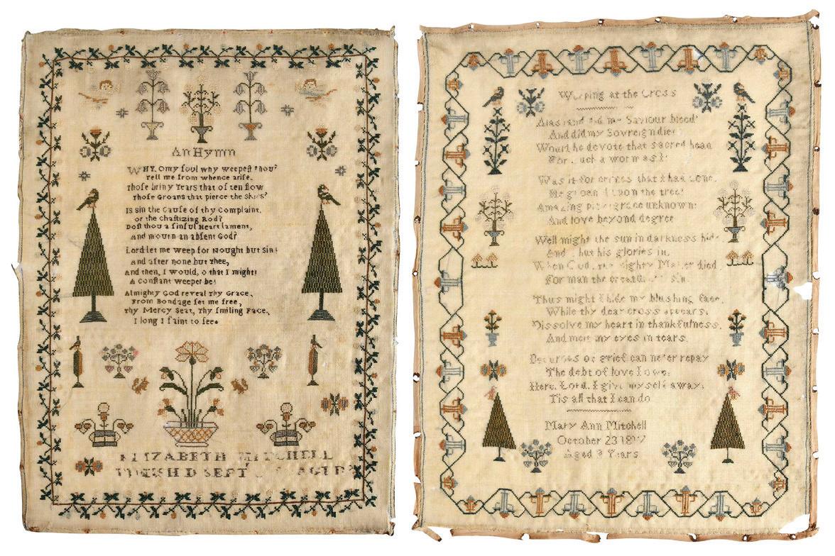 Two American Hymnal Needlework Samplers, Mitchell Family early 19th century, comprising; sampler signed “Elizabeth Mitchell/finish’d Sept... aged...”; sampler signed “Mary Ann Mitchell/October 23rd 18...”aged ... years”; each approx. 17-3/4 x 13-3/4 in., both with spotting and discoloration, some slight tears to bodies and edges, some loss to stitching, notably at inscriptions, wear commensurate with age and use