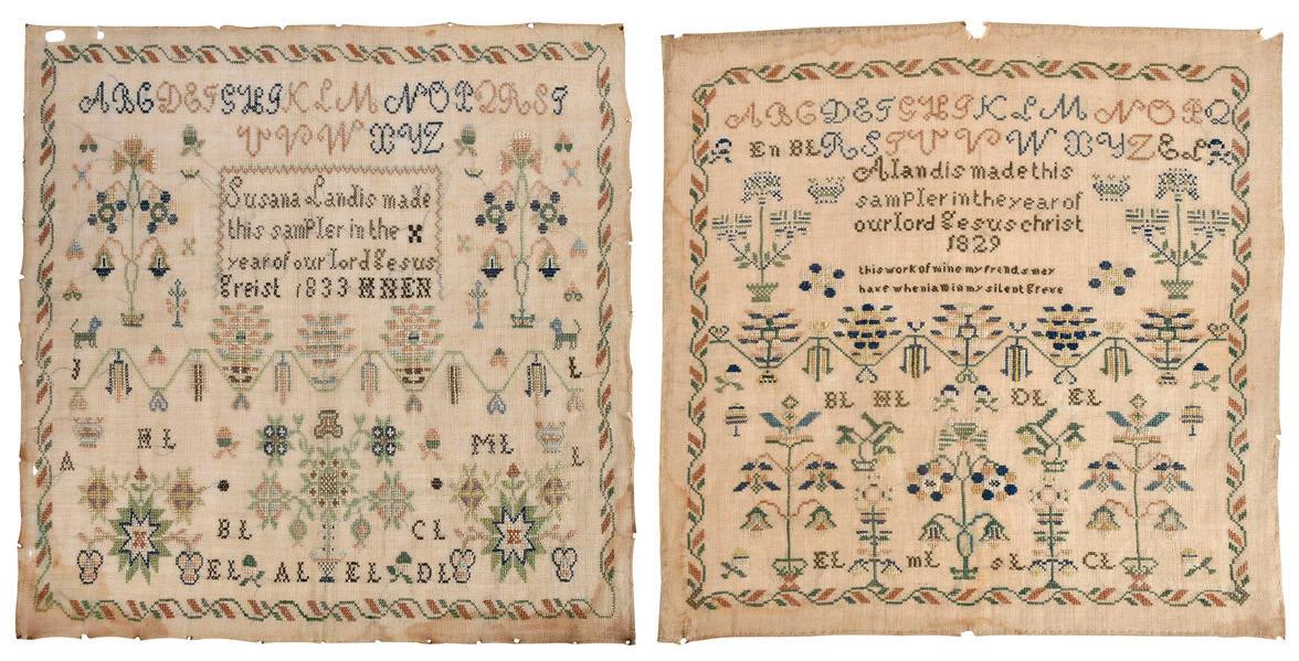 Two Signed and Dated Pennsylvania Needlework Samplers by Sisters two silk on linen samplers worked by sisters, comprising: one initialed and dated “A landis made this sampler in the year of our Lord Gesus [sic] christ 1829”, with alphabet, a verse, initials of family members, floral motifs, and leafy border; one signed and dated “Susana Landis made this sampler in the year of our lord gesus [sic] greist [sic] 1833”, with alphabet, family initials, floral and geometric motifs, and leafy border; larger 18 x 17-3/4 in., slight fading to embroideries, toning to fabric, scattered frayed edges with nail holes; initialed example with leaching of green dye at bottom center