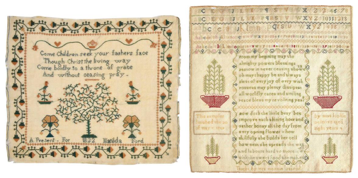 Mountmellick’s Provincial School was founded in 1786 to provide boarding and a moral education for children from Quaker families “in low circumstances” and closed in 1920. Plain and fancy needlework was taught to the female students so that they could earn money to purchase their textbooks. Hannah’s verses were written by Jonathan Swift in 1731. Margret’s verses are stanzas from a Christian hymn based on Isaiah 55:1.