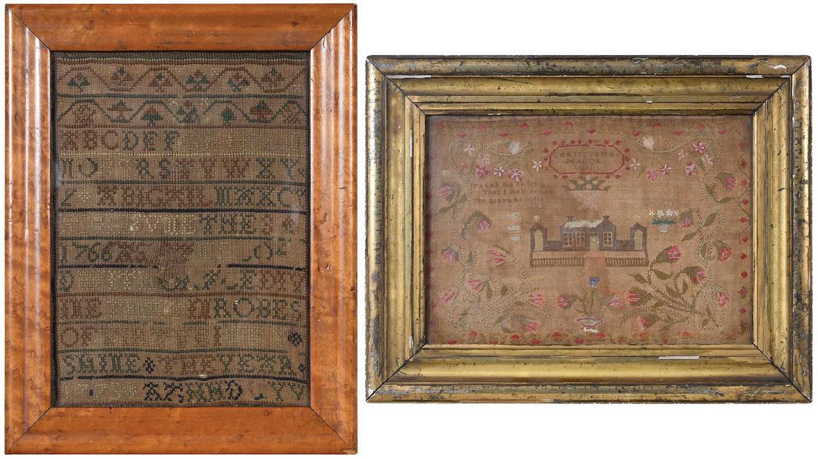 Two Framed British Needlework Samplers comprising: Scottish, signed and dated “Christiana Major/1826”, sight 11-3/4 x 163/4 in.; gilt wood frame, 18 x 23 x 1-1/4 in.; possibly Cornish, needlework sampler dated “1775”, sight 10-1/4 x 7-1/2 in.; carved wood frame, 13 x 10-1/2 x 1 in., not examined out of frames, each with overall toning, stains, and wear commensurate with age; Christiana example slightly off-center in frame, frame with numerous chips and loss to veneer, some scratches to glass pane; 1775 example with holes and loss to stitching, notable discoloration, frame with light wear and abrasions