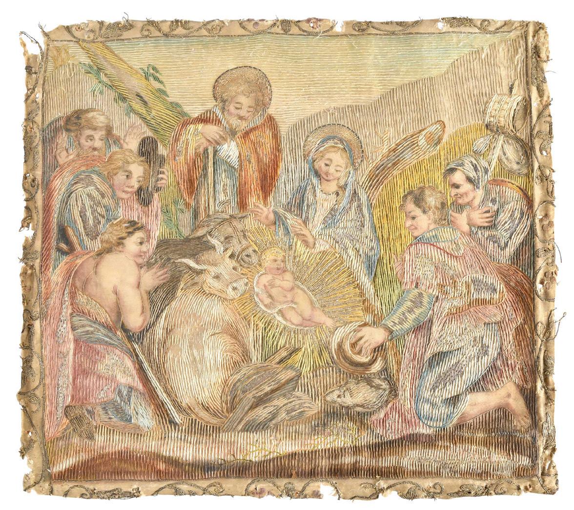 Italian 17th Century Embroidery, Adoration of the Shepherds silk and metallic thread on linen ground, figures with painted faces, 12 x 13-1/4 in.; unframed, retains bright coloring, some tears and loose threads at edges, small holes and some loss to stitching