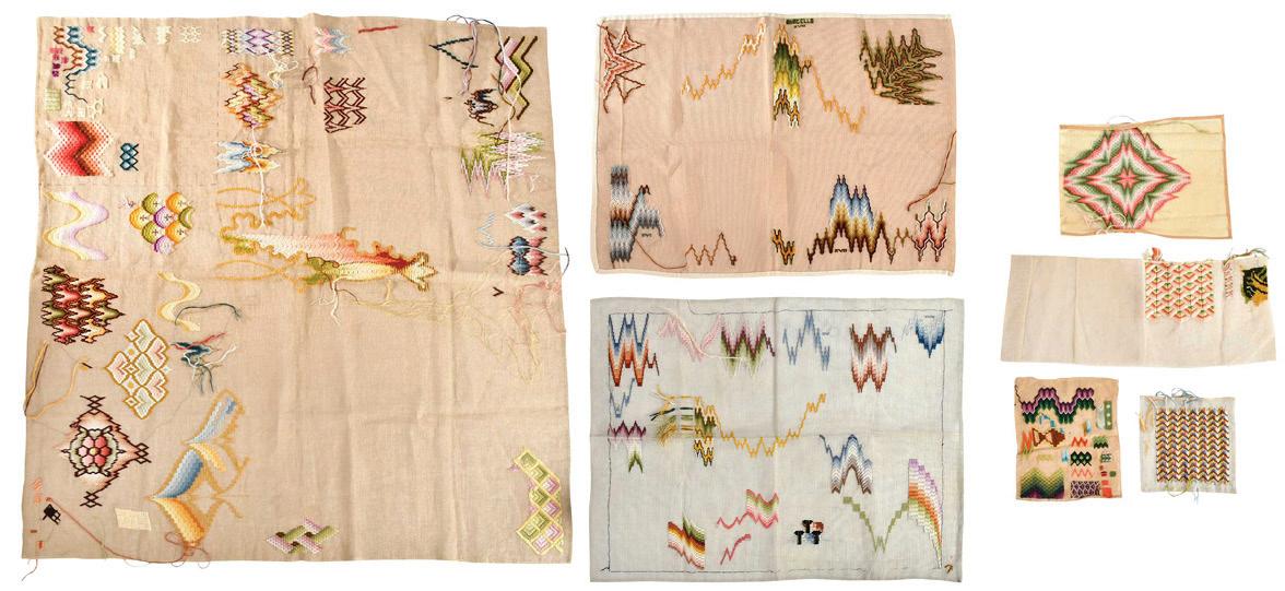 Seven Needlework Bargello Pattern Samplers probably American, early 20th century, one inscribed “Bargello/XVII”, largest approx. 38 x 42 in., numerous loose threads, slight discoloration and staining to canvas backings
