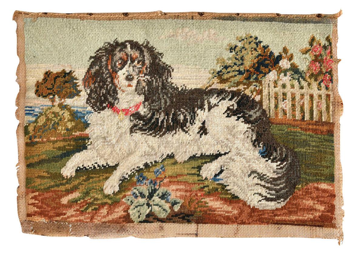 Victorian Needlework Picture, King Charles Spaniel American, late 19th century, wool and linen on cotton, 6 x 8-1/2 in., some fraying and loss to edges, slight discoloration, some loose threads at back