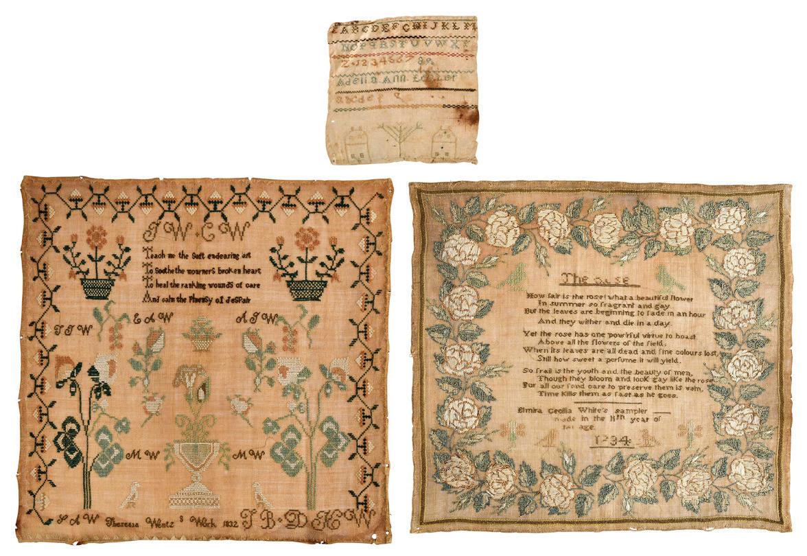 three silk on linen pictorial samplers: one signed and dated “Elmira Cecilia White’s sampler made in the 11th year of her age 1834”, with a verse and scattered bird motifs enclosed in a large leafy rose border, cross and satin stitches, 16 x 17 in.; one signed and dated “Theresia Wentz s Work 1832”, with a verse, floral urn, baskets, and sprays enclosed in a strawberry border, cross, queen, and satin stitches, 17-1/2 in. x 17-1/2 in.; one signed “Adelia Ann Lester”, with an alphabet, numbers, two houses and a tree, likely mid-19th century, with cotton thread, cross stitches, 7 in. x 7 in., Elmira example lacking a few cross stitches and with fraying to fabric edges; Theresia example with slight fading of embroidery, spaced nail holes around all fabric edges; Adelia example with three large stains and small hole at upper left corner