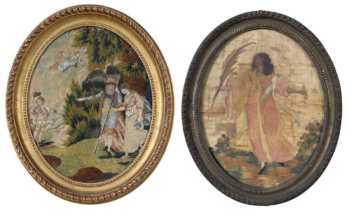 Three Pastoral Needleworks, Two Attributed to Miss Saltonstall comprising: American, 19th century, needlework on painted silk featuring family and pastoral scene; English, 18th century, pair of framed oval needleworks, one inscribed “No 13/Miss Saltonstall/May 18th/1790” frame verso; largest 25 x 35 in., American example with numerous tears and holes to left side, notable loss to stitching at tree trunks, some staining, spotting, and discoloration to silk backing; one oval example with frame broken but retained, shattering to silk background; the other with cracks to frame, not examined out of frame
