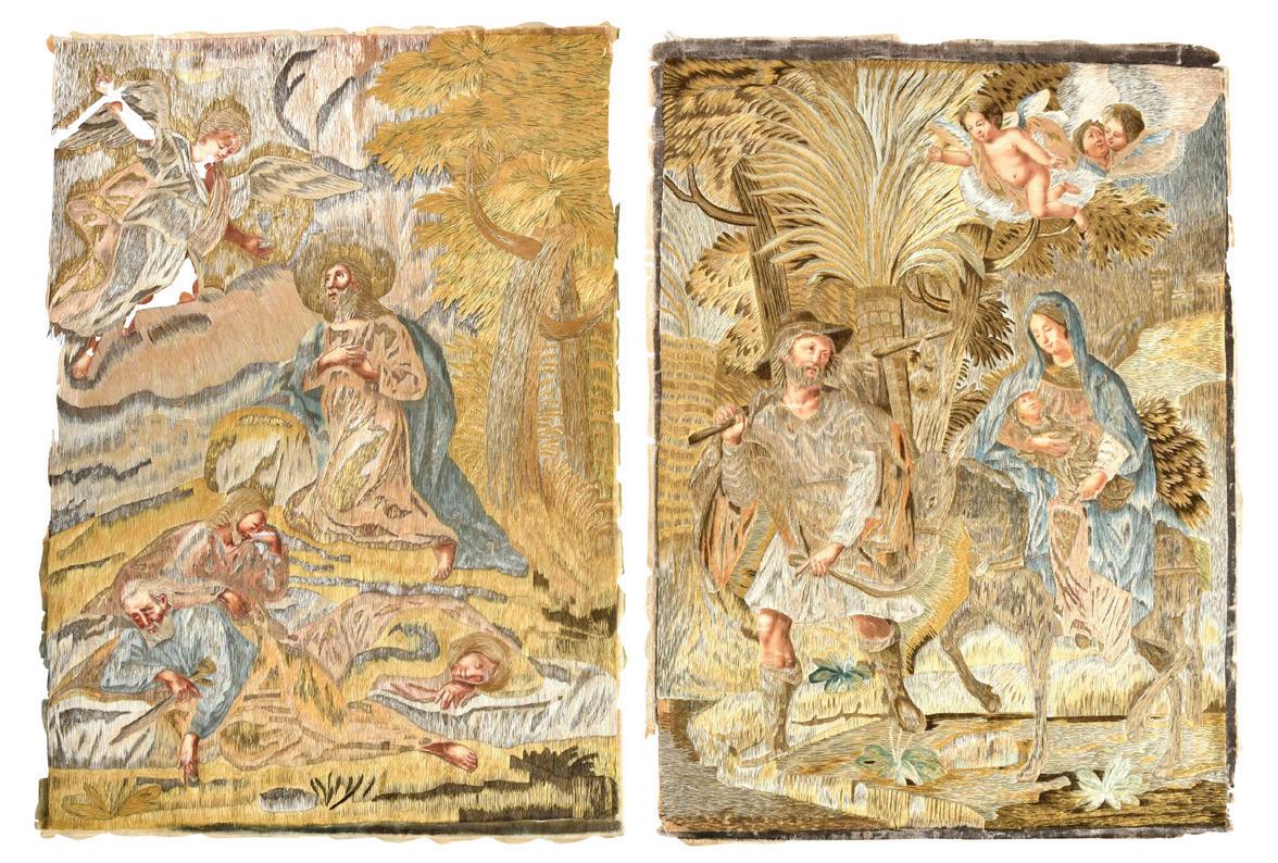 18th century, silk and metallic thread on silk background with hand painted hands and faces, each approx. 19-7/8 x 14-1/2 in.; unframed, some tears, notably to hands and faces, tears, fraying, and loss to backing and edges; one panel with notable tears and losses to angel, tear to bottom right corner