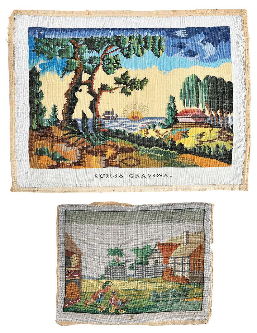 Two Italian Beadwork Pictures, Napoleon’s Tomb and Barnyard Scene 19th century, comprising: Tomb of Napoleon, inscribed to bottom border “Luigia Gravina”, 14 x 18-3/4 in.; barnyard scene, initialed at bottom border “M”, 9-1/2 x 11-1/2 in., some tattering and loss to linen, minor losses to beadwork, wear commensurate with age and use