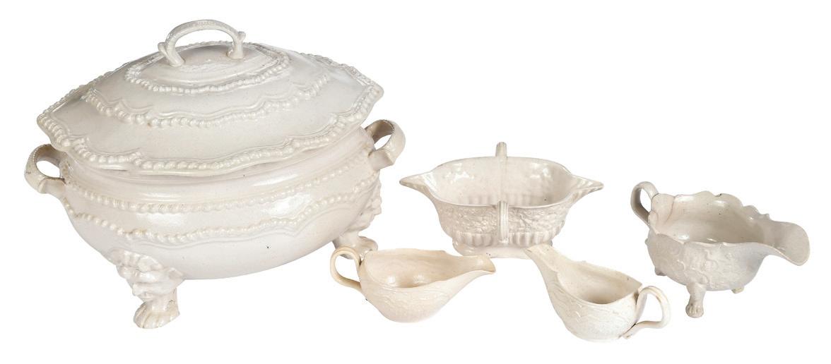 18th century, molded mask and scrollwork decoration, comprising: sauce tureen with paw form feet, three creamers, double lipped sauce boat, largest 8 x 12 x 9 in., scattered pinholes, craters, and small firing anomalies throughout, all with scattered hairlines and small edge chips, surface dirt; footed creamer with break and repair to handle and rim