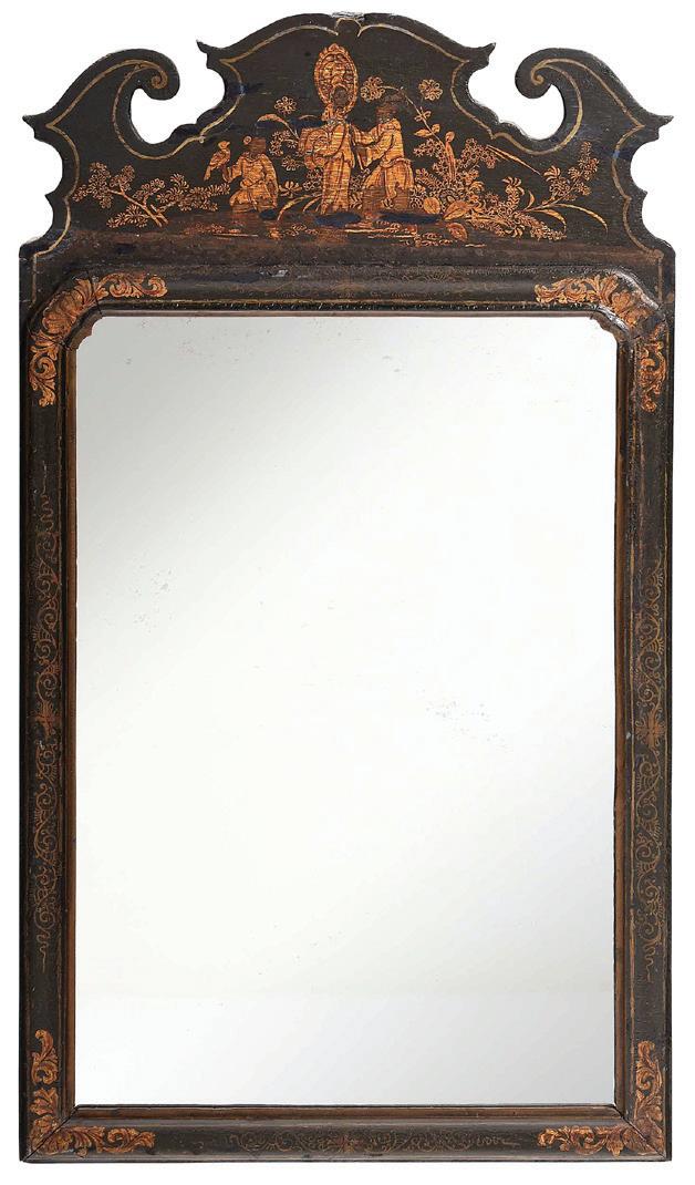probably British, early 18th century, japanned frame with scrolled crest depicting courtiers in gilt, 25-1/2 x 14-1/2 in., scattered losses to japanning, especially at lower part of crest, mirror plate replaced