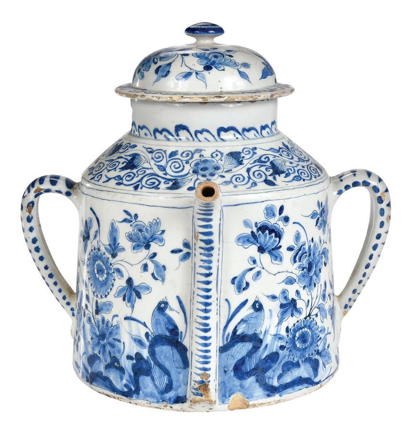 Large English Delft Blue and White Posset Pot early 18th century, ornately decorated with flowers and birds, blue dashed handles and spout, 12-1/4 x 13 x 11 in., pinholes, glaze voids, and some chipping throughout, hairline to base, cover or lid likely repaired