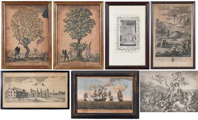English, 18th century, comprising: large platter, touchmark of Robert King, 16-1/2 x 16-1/2 x 1 in.; six plates with incised boar’s head decoration, touchmarks of John Townsend, largest 10-3/4 x 10-3/4 x 1 in., typical scratches, dents, and wear consistent with age and use, scattered spotting and areas of discoloration