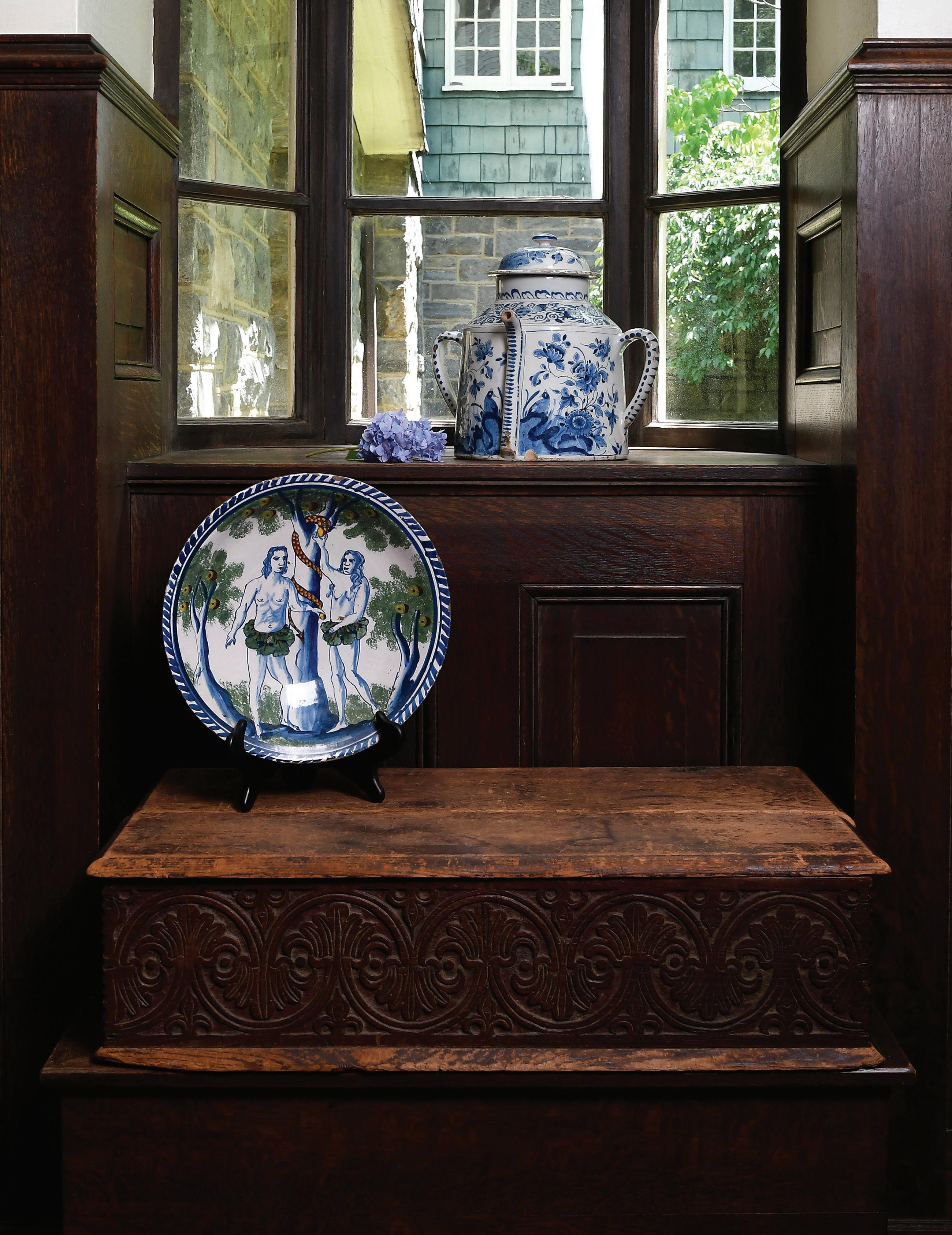 English Delft Adam and Eve Charger probably Bristol, early 18th century, in yellow, red, green, and blue with blue dash border, 3 x 12-5/8 x 12-5/8 in., overall good condition, pinholes, glaze voids, and edge chips, wear commensurate with age and use