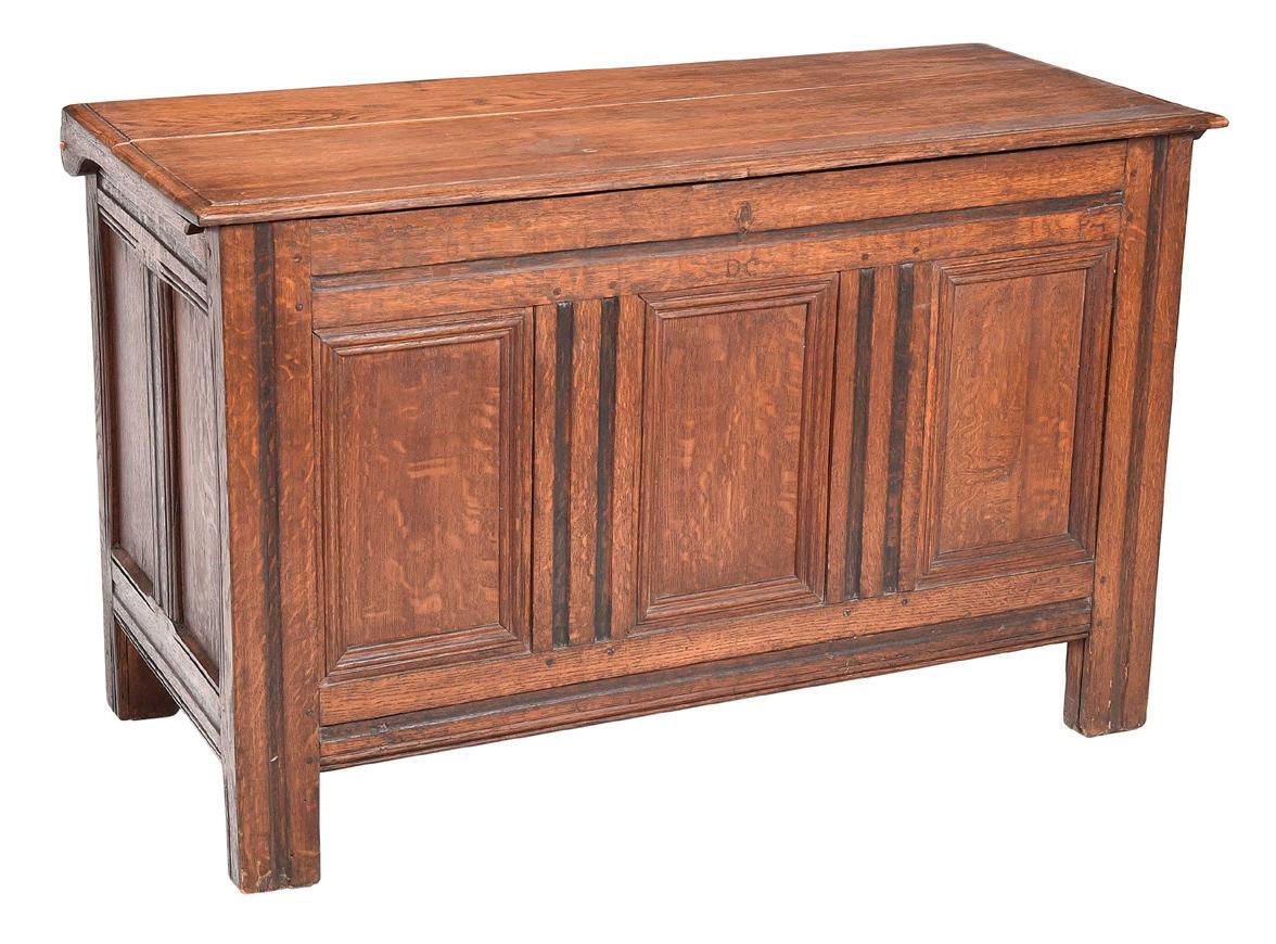 Rare and Exceptional Pilgrim Century Massachusetts Carved Joined Chest attributed to the shop of Thomas Dennis, Ipswich, Massachusetts, 1680-1690, oak with white pine secondary, elaborately carved and paneled, facade with traces of red, black, and white paint, paneled back and case sides, open interior, carved corner brackets, original tall stile feet, chestnut bottom boards, carved cipher or initial in the left side molding, 32-1/2 x 47-1/2 x 22-3/4 in., top replaced, lacking interior till, oval patch and repair at front of top rail