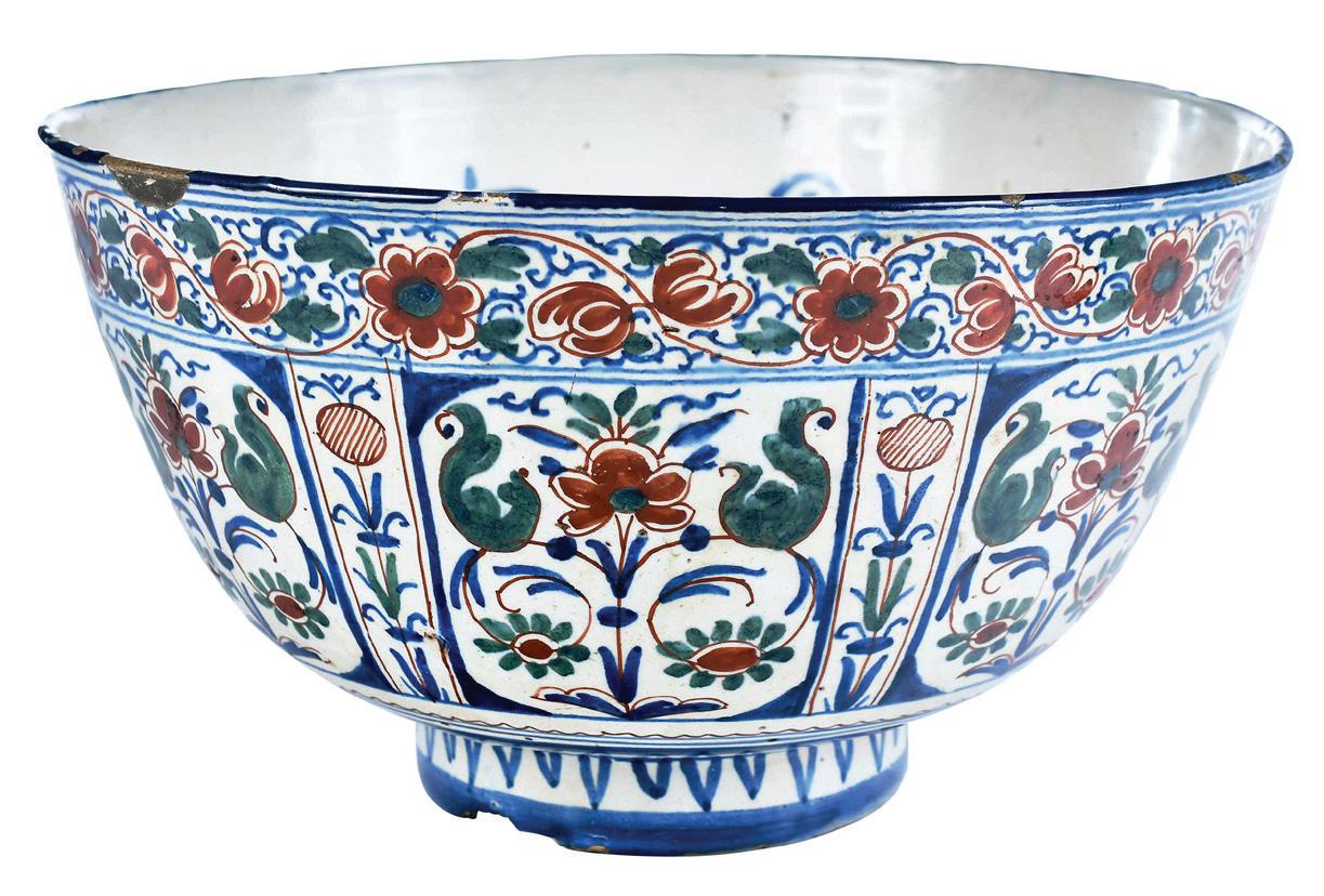 English Delft Deep Punch Bowl with Polychrome Panel Decoration probably Bristol, early 18th century, exterior in blue, red, and green floral decoration, interior with floral spray, 6-3/4 x 11-3/4 x 11-3/4 in., large hairline crack to interior, likely oversprayed with repairs, some chipping to rim and foot, large chip to foot, hairlines at rim, scattered scratches and abrasions