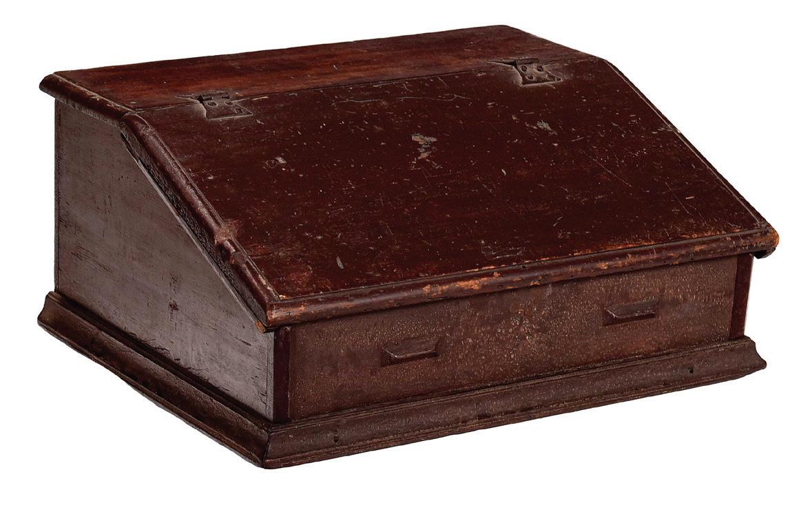 For a collection as singular as that of John and Marie-Teresa Vander Sande, a single auction would not suffice. Now we find ourselves at the second, one every bit as grand and rich in beautiful examples of 17th and 18th century furniture, ceramics, glass, and more as the one previous. The love the Vander Sandes had, and still have, for this era of history is readily evident from looking at this collection. The human element, that factor most important to them in any given piece, is well-represented in each object in the sale. That being said, everything previously mentioned about the Vander Sande’s collection still rings true here and now, and as such the reader will not be belabored with repetition. Instead, the focus will be on the new, and there is a considerable amount of it worthy of mention. The highlights of this sale include a Boston Cromwellian high back chair of extreme rarity, a rare Massachusetts carved joined chest, three Benjamin Blythe-attributed portraits, four carved Nottingham double-walled mugs, and a Charles II needlework writing box. But these are only a few of the many wonderful works to be included in this auction. We invite you to peruse the full sale at your leisure, and join us in another journey down the High Road.