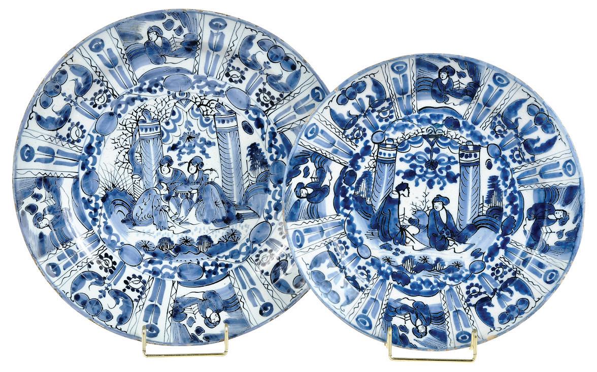French Faience Blue and Manganese Teacup and Saucer probably Nevers, 18th century, each in Chinoiserie decoration of scholarly figures in garden setting, cup 2-3/4 x 4 x 2-7/8 in., saucer 1-1/8 x 5-1/2 x 5-1/2 in., some pinholes, glaze voids, and chipping to edges, some wear commensurate with age and use