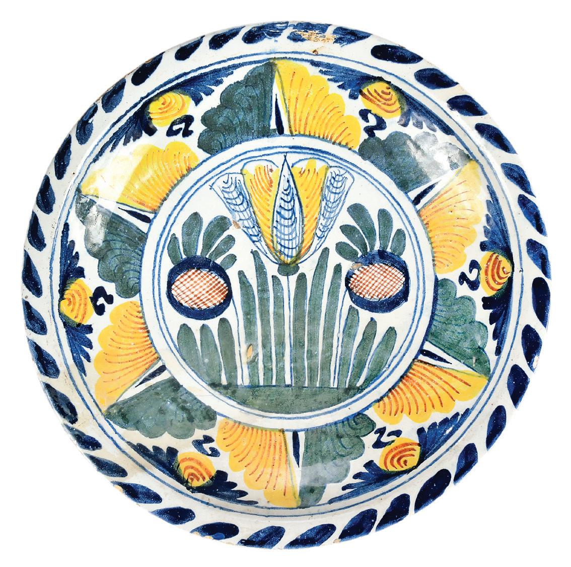 English Delft Polychrome Tulip Charger probably Bristol, early 18th century, in yellow ochre, green, and blue with tulips and other flowering plants, with blue dash border, 3 x 13-1/2 x 13-1/2 in., some pinholes, glaze voids, and roughness and chipping to rim, repair and retouch to lower left rim (see blacklight photos)