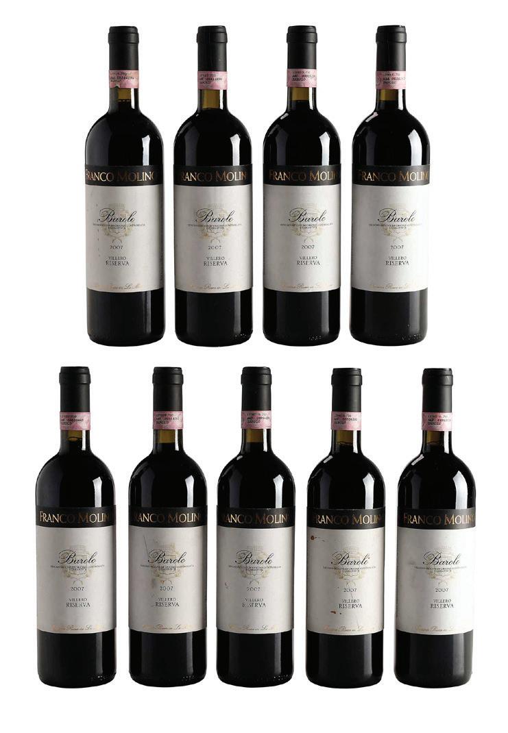 Nine Bottles of 2007 Franco Molino Barolo Villero Riserva vintage 2007, Italy, Nebiolo, 750 ml, alcohol 14.5% by volume, each with fill into neck, capsules and labels in fair condition with some nicks and minor bin soilage, one with stains
