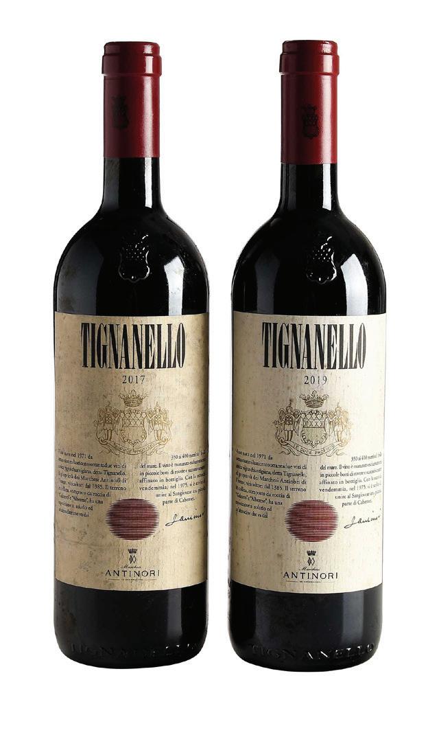 Two Bottles of 2017 & 2019 Marchesi Antinori Tignanello Toscana IGT one bottle vintage 2017, Tuscany, Italy, red blend, 750 ml, alcohol 14% by volume; one bottle vintage 2019, Tuscany, Italy, red blend, 750 ml, alcohol 14% by volume, each with high fill into neck, slightly depressed but firm cork, capsules in overall good condition, labels with some wrinkling and bin soilage