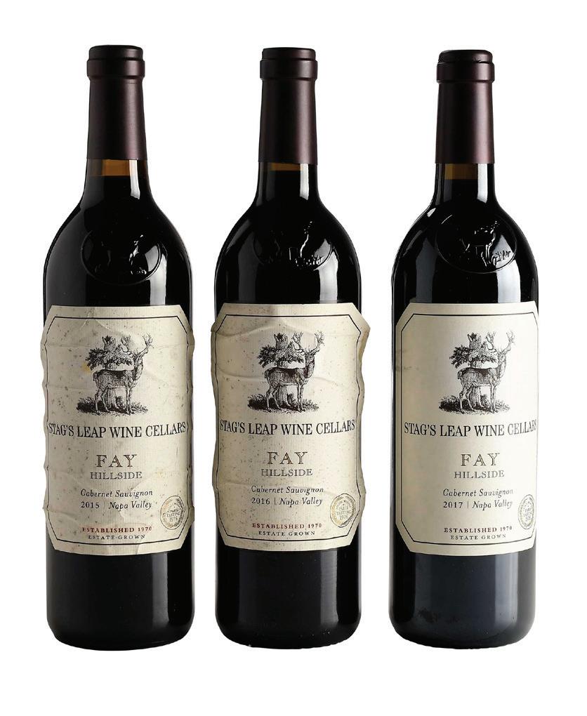 Three Bottles of 2015-2017 Stag’s Leap Fay Hillside one bottle 2015, Napa Valley, Cabernet Sauvignon, 750 ml, alcohol 14.5% by volume; one bottle 2016, Napa Valley, Cabernet Sauvignon, 750 ml, alcohol 14.5% by volume; one bottle 2017, Napa Valley, Cabernet Sauvignon, 750 ml, alcohol 14.8% by volume, each with high fill into neck, one slightly depressed but firm cork, capsules in overall good condition, two with notable wrinkling and some moisture damage to labels, one label with minor marks