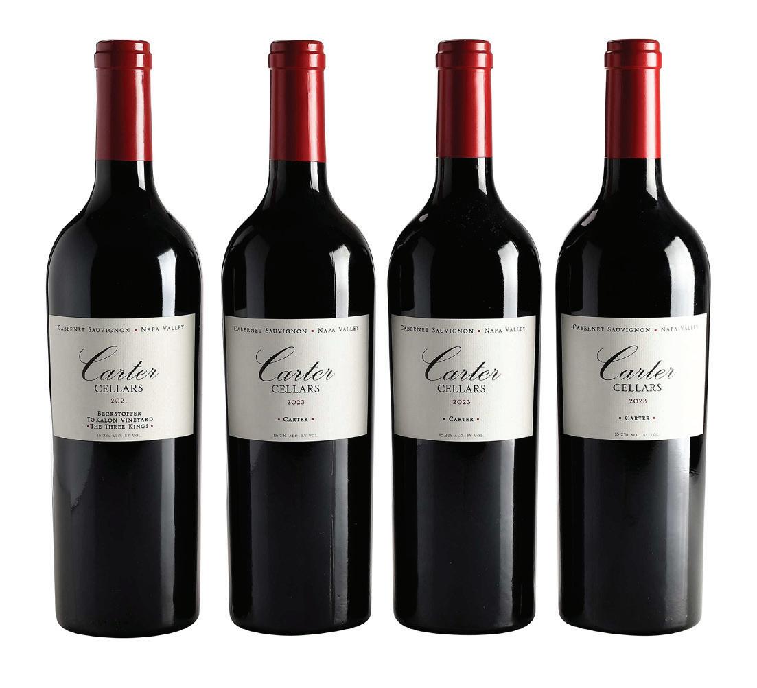 Four Bottles of 2021 & 2023 Carter Cellars Cabernet Sauvignon one bottle vintage 2021, Beckstoffer To Karlon Vineyard “The Three Kings”, Napa Valley, 750 ml, alcohol 15.2% by volume; three bottles vintage 2023, “Carter”, Napa Valley, 750 ml, alcohol 15.2% by volume, high fill into necks, minorly depressed but firm corks, capsules and labels in overall good condition
