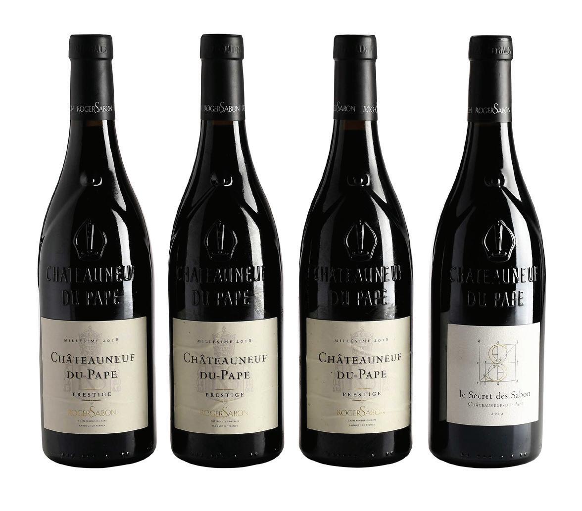 three bottles of Prestige, vintage 2018, Rhone, France, 750 ml, alcohol 15% by volume; one bottle of le Secret des Sabon, vintage 2019, Rhone, France, 750 ml, alcohol 15.5% by volume, each with high fill into neck, labels and capsules in overall good condition, Prestiges with minor wrinkling to labels