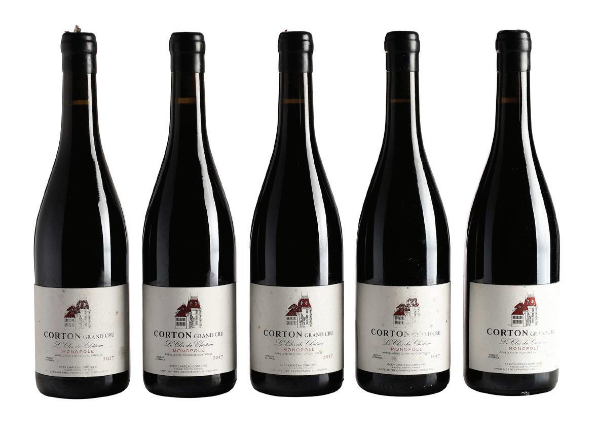 Five Bottles of 2019 Caroline Frey Corton Grand Cru Le Clos du Chateau Monopole, five bottles vintage 2017, Cote de Beunne, France, Red Burgundy, 750 ml, alcohol 13% by volume, each with high fill into neck, wax capsules in good condition, some abrasions, loss, and staining to labels