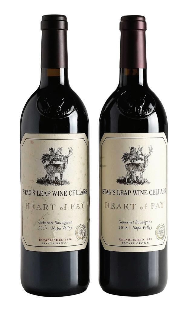 Two Bottles of 2017 & 2018 Stag’s Leap Heart of Fay one bottle vintage 2017, Napa Valley, Cabernet Sauvignon, 750 ml, alcohol 14.5% by volume; one bottle vintage 2018, Napa Valley, Cabernet Sauvignon, 750 ml, alcohol 14.5% by volume, each with fill into neck, slightly depressed but firm corks, capsules in overall good condition, 2017 label with some wrinkling and moisture damage, 2018 label with some minor marks