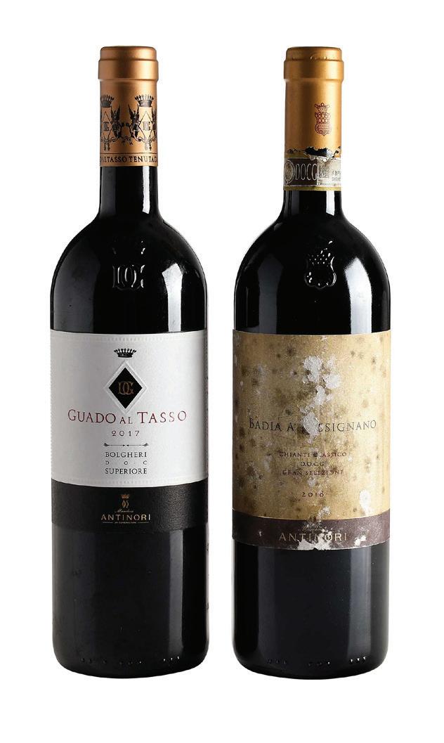 one bottle 2017 Tenuta Guado al Tasso Bolgheri Superiore, Tuscany, Italy, 750 ml, alcohol 14.5% by volume; one bottle vintage 2018 Badia a Passignano, Tuscany, Italy, 750 ml, alcohol 14.5% by volume, each with fill into neck; Badia with slightly depressed but firm cork, tears to capsule, notable discoloration, abrasion, and moisture damage to labels