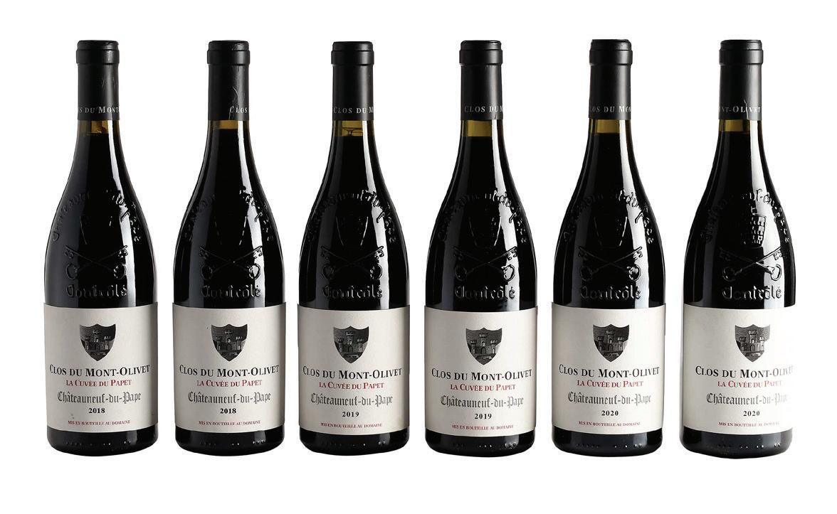two bottles vintage 2018, Rhone, France, Chateauneuf-du-Pape, 750 ml, alcohol 16% by volume; two bottles vintage 2019, Rhone, France, Chateauneuf-duPape, 750 ml, alcohol 16% by volume; two bottles vintage 2020, Rhone, France, Chateauneuf-du-Pape, 750 ml, alcohol 16% by volume, fill into neck, one 2019 with slightly depressed but firm cork, capsules and labels in overall good condition with minor nicks and wrinkling