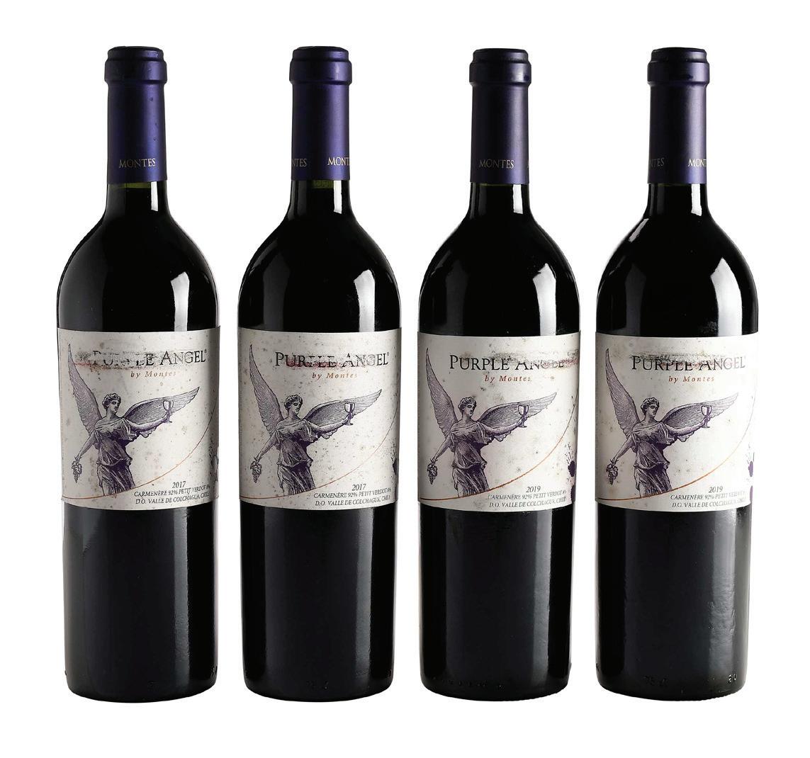Four Bottles of 2017 & 2019 Montes Purple Angel one bottle vintage 2017, Valle de Colchagua, Chile, Carmenere & Petit Verdot, 750 ml; three bottles vintage 2019, Valle de Colchagua, Chile, Carmenere & Petit Verdot, 750 ml, each with high fill into neck, slightly protruding corks, capsules in overall good condition, labels with some abrasion, moisture damage, and loss