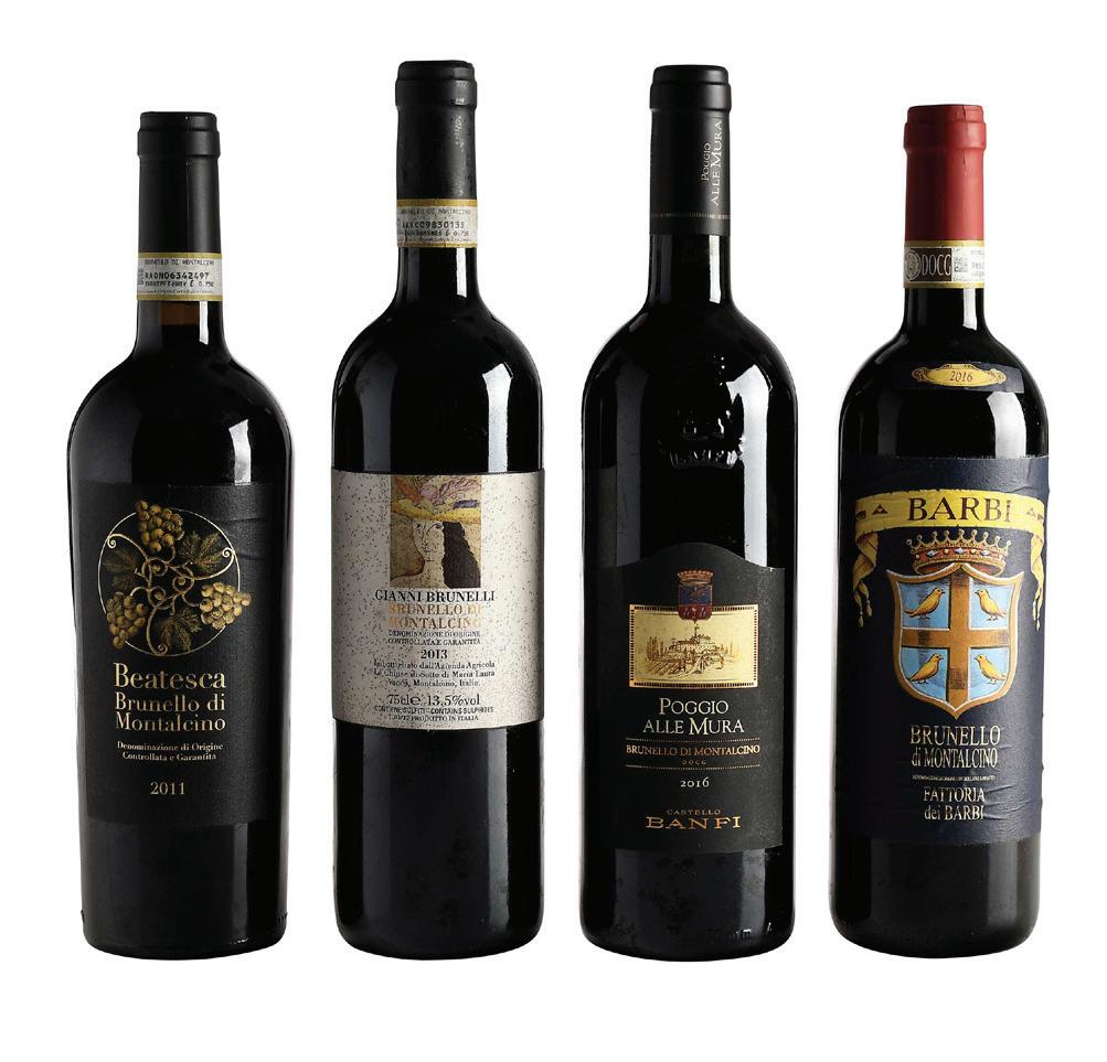 one bottle Beatesca, vintage 2011, Tuscany, Italy, 750 ml, alcohol 14% by volume; one bottle Gianni Brunelli, vintage 2013, Tuscany, Italy, 750 ml, alcohol 13.5% by volume; one bottle Fattoria dei Barbi, vintage 2016, Tuscany, Italy, 750 ml, alcohol 14.5% by volume; one bottle Castello Banfi Poggio alle Mura, vintage 2016, Tuscany, Italy, 750 ml, alcohol 15% by volume, each with fill into neck, capsules and labels in overall good condition with some minor nicks and wrinkling, Gianni Brunelli with moisture damage to labels
