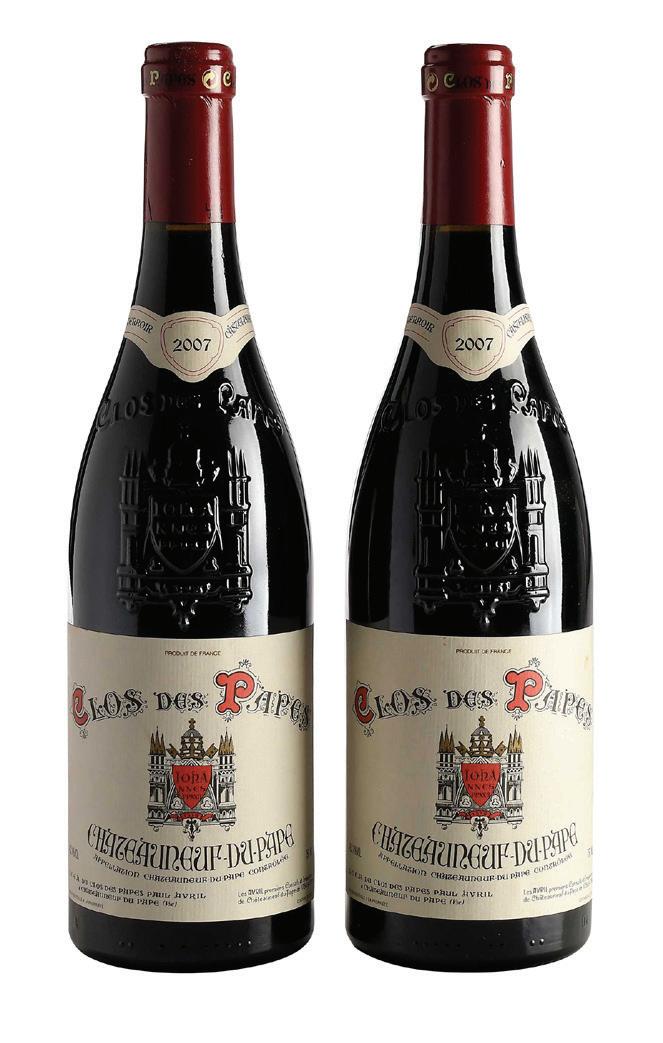 Two Bottles of 2007 Paul Avril Clos des Papes two bottles vintage 2007, Rhone, France, Chateauneuf-du-Pape, 750 ml, alcohol 14% by volume, high fill into necks, minorly depressed but firm corks, capsules with slight wrinkling and nicks, labels in overall good condition with some minor nicks