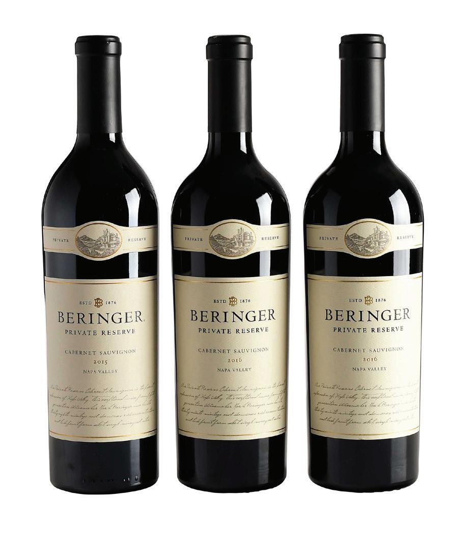 Three Bottles of 2015 & 2016 Beringer Vineyards Private Reserve Cabernet Sauvignon, one bottle vintage 2015, Napa Valley, 750 ml, alcohol 15.2% by volume; two bottles 2016, Napa Valley, 750 ml, alcohol 15.5% by volume, each with high fill into neck, capsules and labels in overall good condition