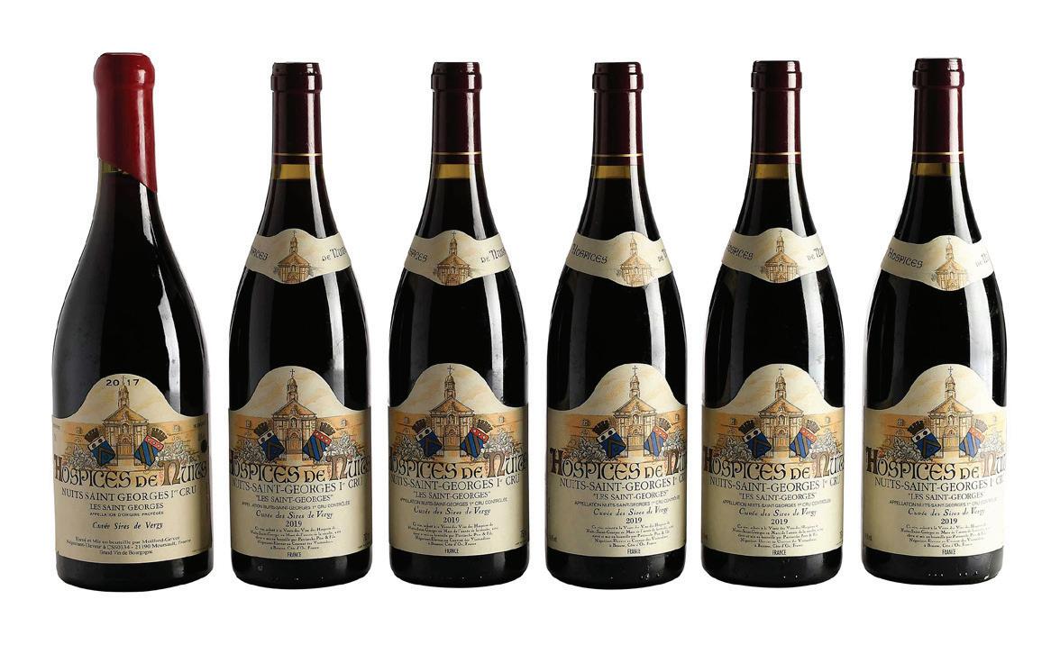 Six Bottles 2017 and 2019 Hospices de Nuits Les Saint-Georges Cuvee des Sires de Vergy, one bottle vintage 2017, France, Pinot Noir, 750 ml, alcohol 13.5% by volume; five bottles vintage 2019, France, Pinot Noir, 750 ml, alcohol 14.5% by volume, each with high fill into neck, capsules and labels in overall good condition; 2017 label with slight lifting and tears to lower corners
