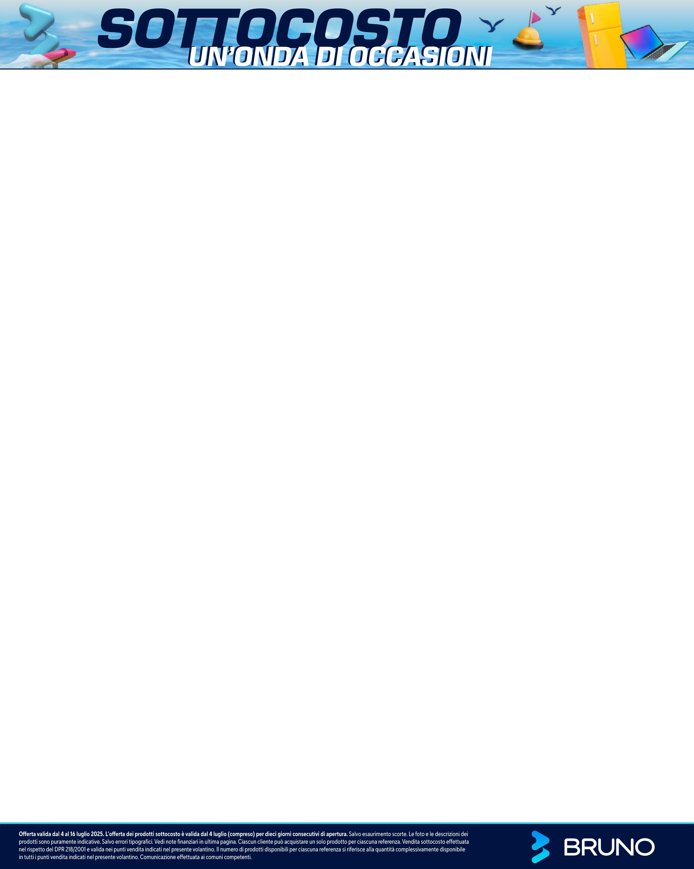 Offerta valida dal 4 al 16 luglio 2025. L’offerta dei prodotti sottocosto è valida dal 4 luglio (compreso) per dieci giorni consecutivi di apertura. Salvo esaurimento scorte. Le foto e le descrizioni dei prodotti sono puramente indicative. Salvo errori tipografici. Vedi note finanziari in ultima pagina. Ciascun cliente può acquistare un solo prodotto per ciascuna referenza. Vendita sottocosto effettuata nel rispetto del DPR 218/2001 e valida nei punti vendita indicati nel presente volantino. Il numero di prodotti disponibili per ciascuna referenza si riferisce alla quantità complessivamente disponibile in tutti i punti vendita indicati nel presente volantino. Comunicazione effettuata ai comuni competenti.