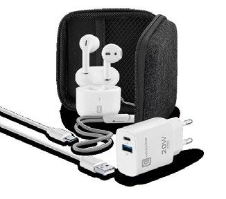 Set con caricatore rapido doppia porta (USB-C 20W e USB 18W), cavo USB-A/USB-C da 100 cm e auricolari true wireless con 20 ore di autonomia, controlli touch e laccetto, racchiusi in una pratica custodia in tessuto