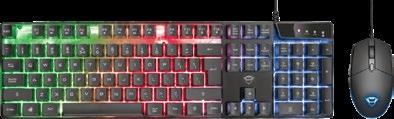Tastiera gaming con 3 modalità di colore LED combinate e luminosità regolabile • funzione Anti-Ghosting: pressione simultanea fino a 8 tasti • piedini antiscivolo in gomma ad altezza regolabile in 2 posizioni • Mouse gaming con selezione velocità (800-3000 DPI) e 6 pulsanti.