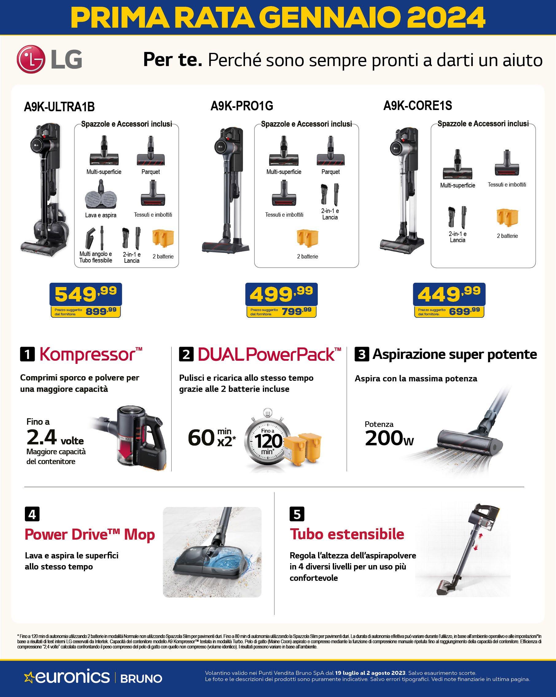 INFORMAZIONI TRASPARENTI Messaggio pubblicitario con finalità promozionale. Offerta di finanziamento valida fino al 11/10/2023 sui prodotti contrassegnati all’interno del presente volantino e dei punti vendita della Bruno S.p.a. Importo finanziabile in 10 mesi da 399€ a 5.000€. Esempi rappresentativi: Prezzo del bene 400€, importo totale del credito € 400,00. Importo totale dovuto dal consumatore € 400,00 con modalità di rimborso addebito diretto in conto (SDD). 10 rate mensili da € 40,00. Pagamento prima rata dopo 30 giorni dalla liquidazione del prestito finalizzato. Durata contratto 10 mesi. TAEG 0,00% inclusivo di: interessi calcolati al TAN FISSO 0,00%; spese e oneri azzerati. Servizio finanziario e salvo approvazione di Compass Banca S.p.A. alla richiesta di finanziamento. Per le condizioni economiche e contrattuali si rimanda ai documenti informativi disponibili presso punti vendita Bruno S.p.a che operano in qualità di intermediari del credito convenzionati senza esclusiva con Compass Banca S.p.A.
